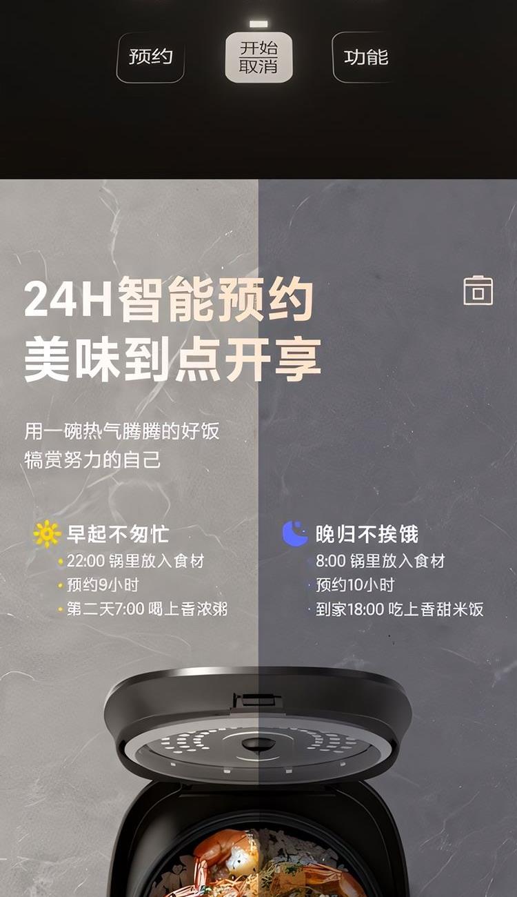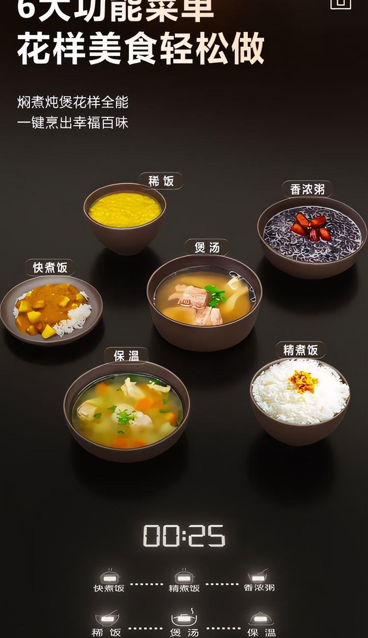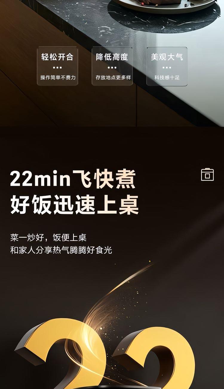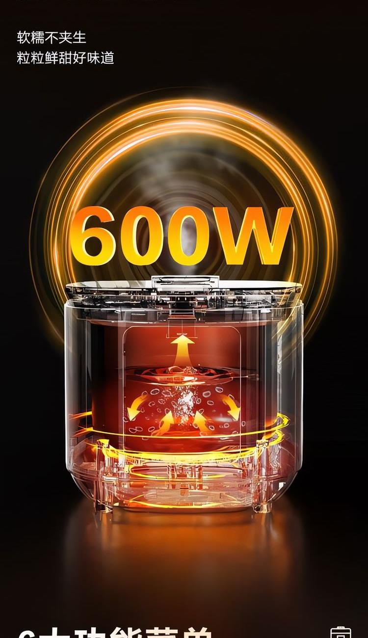 額定功率:600W 額定容量:3.0L 產(chǎn)品毛重:3.0kg 裝 箱 數(shù):1臺(tái) 整箱重量:3.36kg 工作電壓:220V~ 額定頻率:50HZ 產(chǎn)品凈重:2.63kg 產(chǎn)品尺寸:285*248.5*201mm 1. 超薄頂蓋設(shè)計(jì),科技感十足 2. 5大烹飪功能,極簡操作 3. 相同容量,更小體積,空間節(jié)約