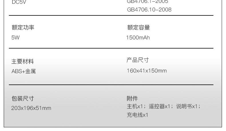 產品參數(shù): 產品型號:CP-N6 額定電壓:3.7V? 額定功率:5W 電池容量:1500mAh 產品尺寸 : 160X150X41mm 包裝尺寸:198*188*49mm 商品條碼 : 6972831860303 產品毛重 : 350g 包裝清單:主機x1、充電線x1、遙控器x1、電池x1、說明書x1