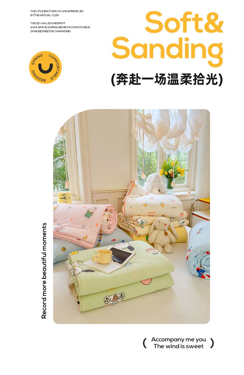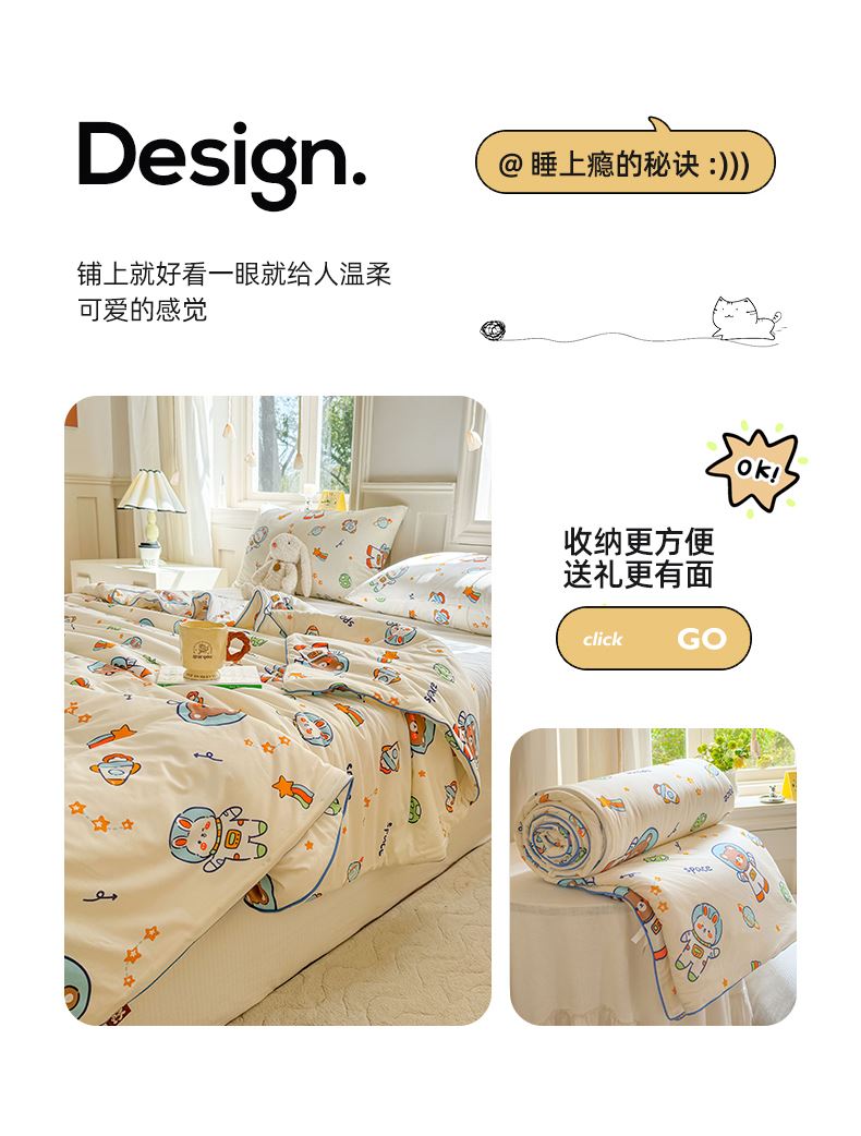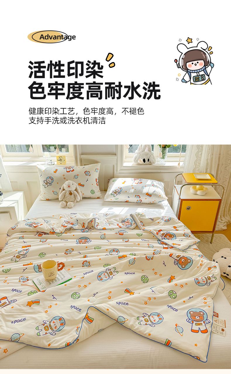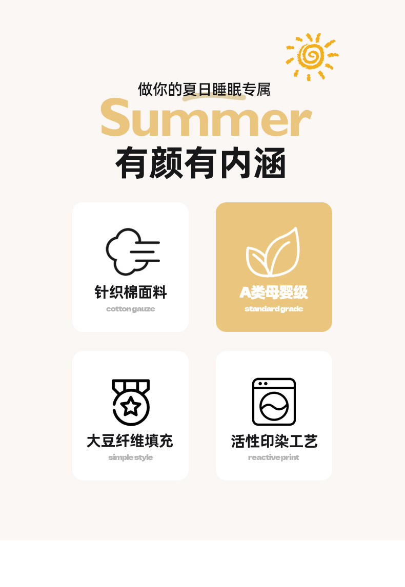 軟糯針織棉,裸睡級親膚甄選高彈針織棉面料,觸感如云朵般軟糯,透氣不悶汗,涼而不冰,夏天裹著它就像陷進溫柔懷抱,裸睡也超舒服。大豆纖維填充,輕盈又透氣填充優(yōu)質(zhì)大豆纖維,蓬松度高、回彈性好,輕盈不壓身,吸濕透氣,告別悶熱黏膩,夏夜也能清清爽爽睡到天亮。