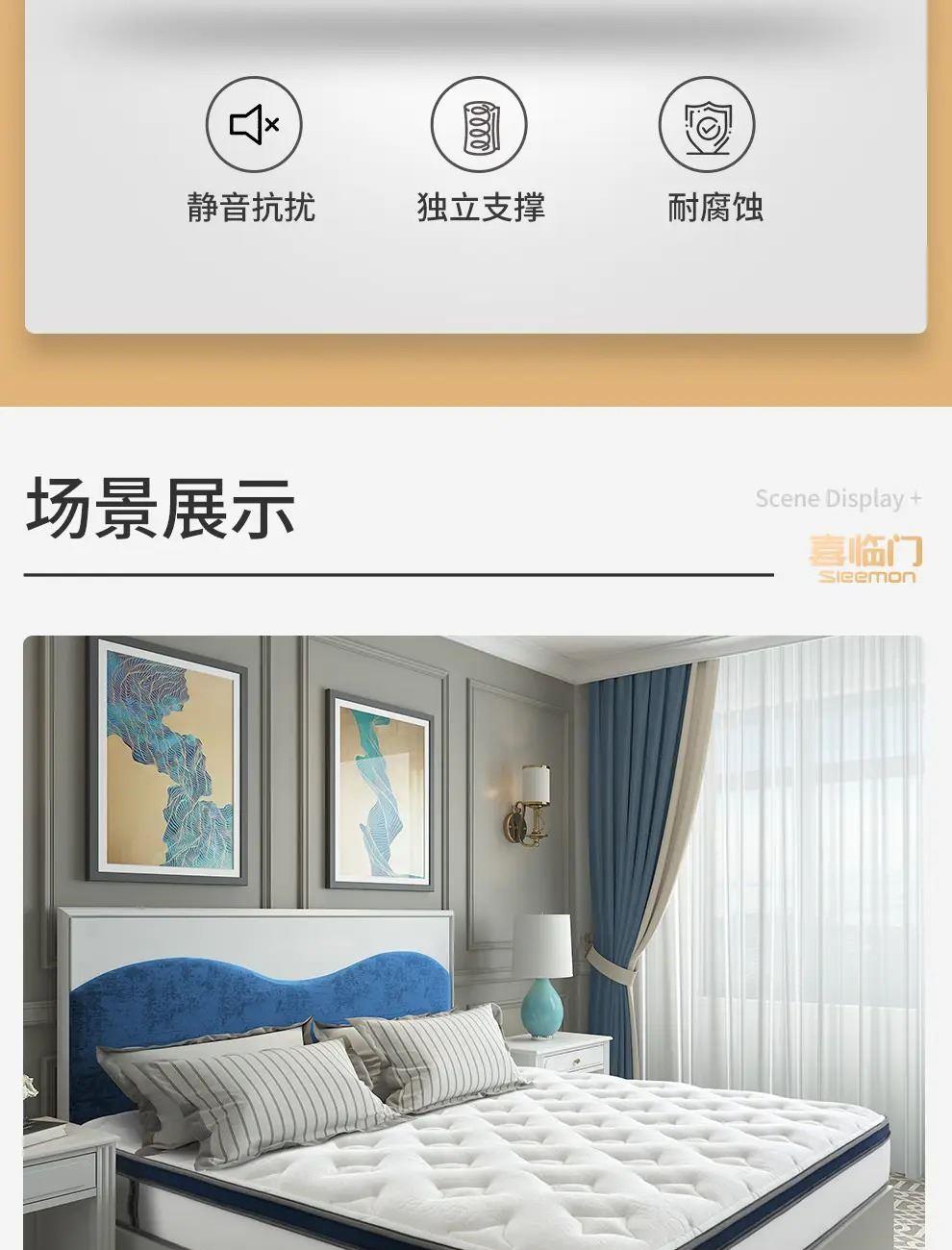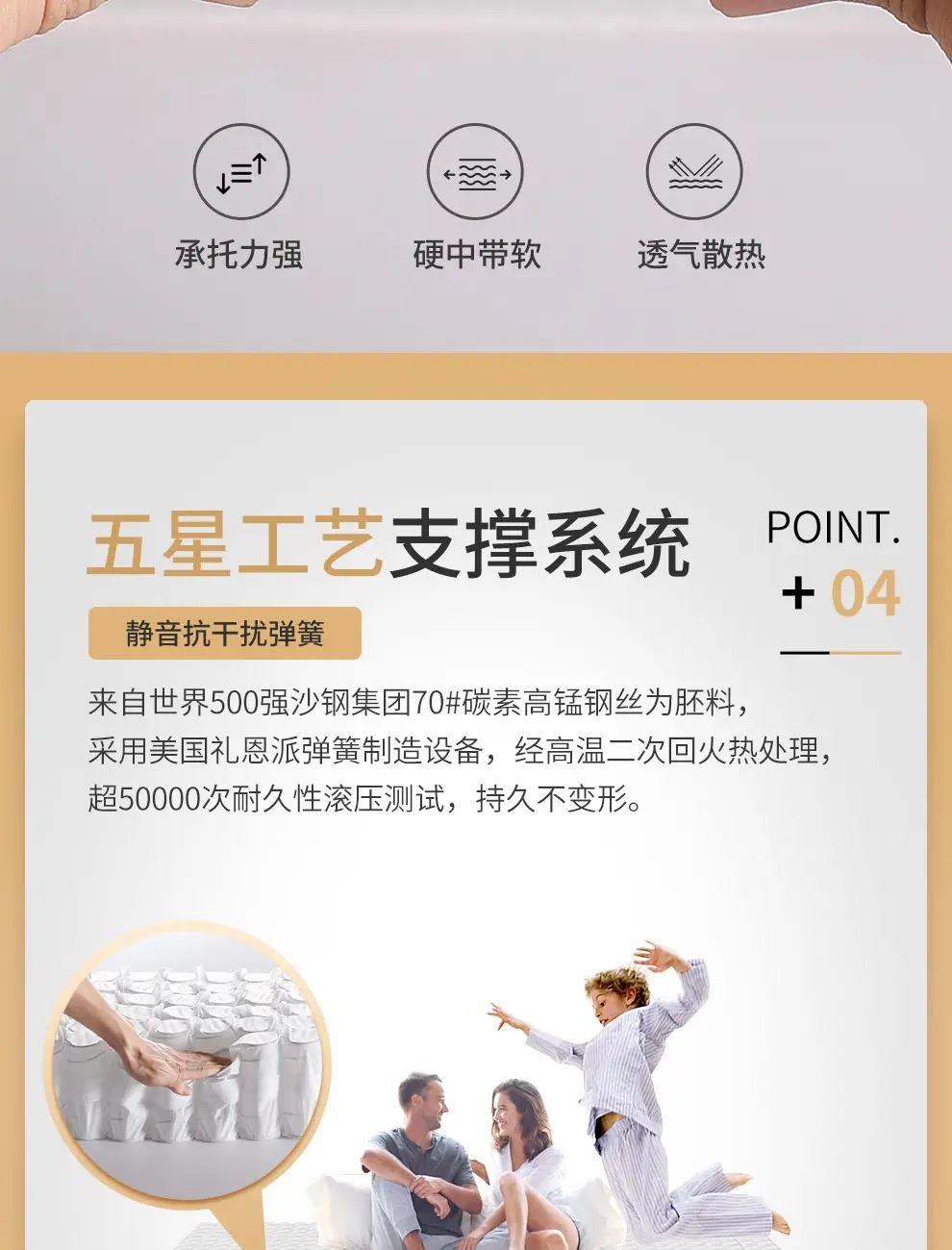 3.科學(xué)承托,分散壓力:獨(dú)立袋裝高精碳素鋼彈簧,自動(dòng)貼合人體曲線,釋放全身壓力,增加深睡時(shí)間。