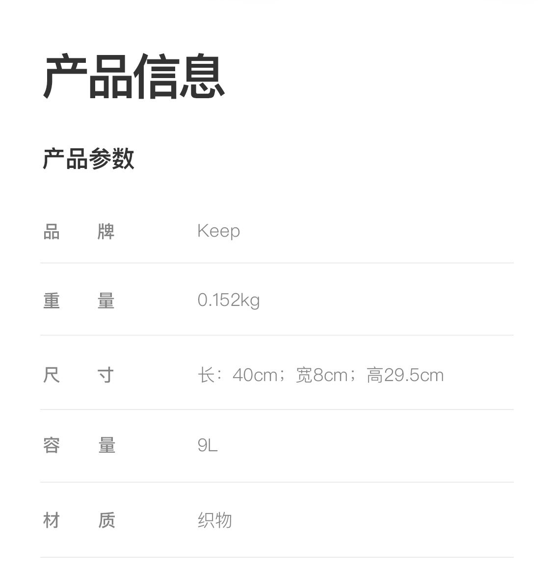 重量:152g 尺寸:長(zhǎng):40cm;寬8cm;高29.5cm 容量:9L 材質(zhì):織物 側(cè)面有網(wǎng)兜水杯袋,收納可懸掛 黃金分區(qū),防潑耐磨,適合通勤、徒步、旅游