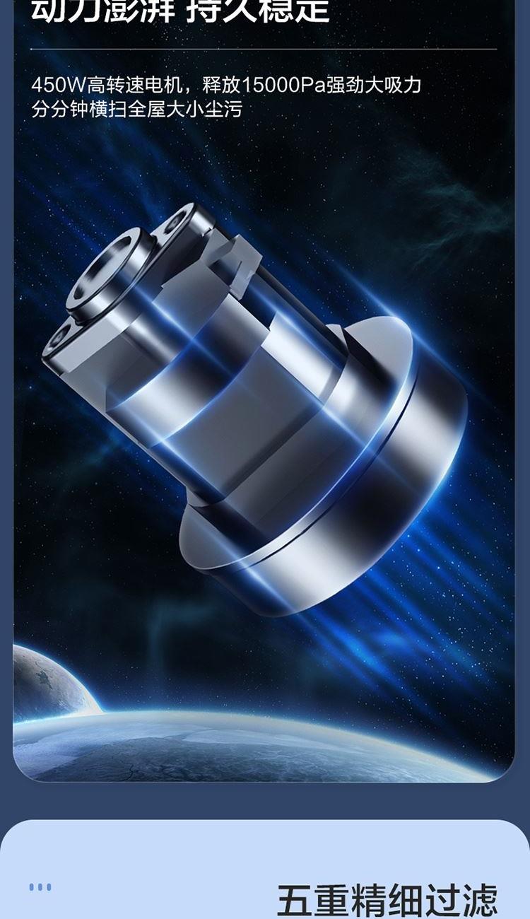 1.、360° 旋風(fēng)大吸力,450W高速電機(jī),15kPa真空度強(qiáng)勁吸塵