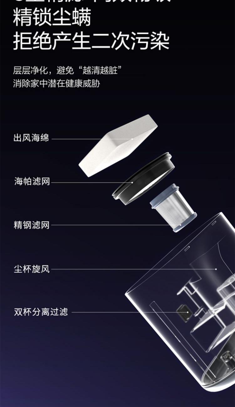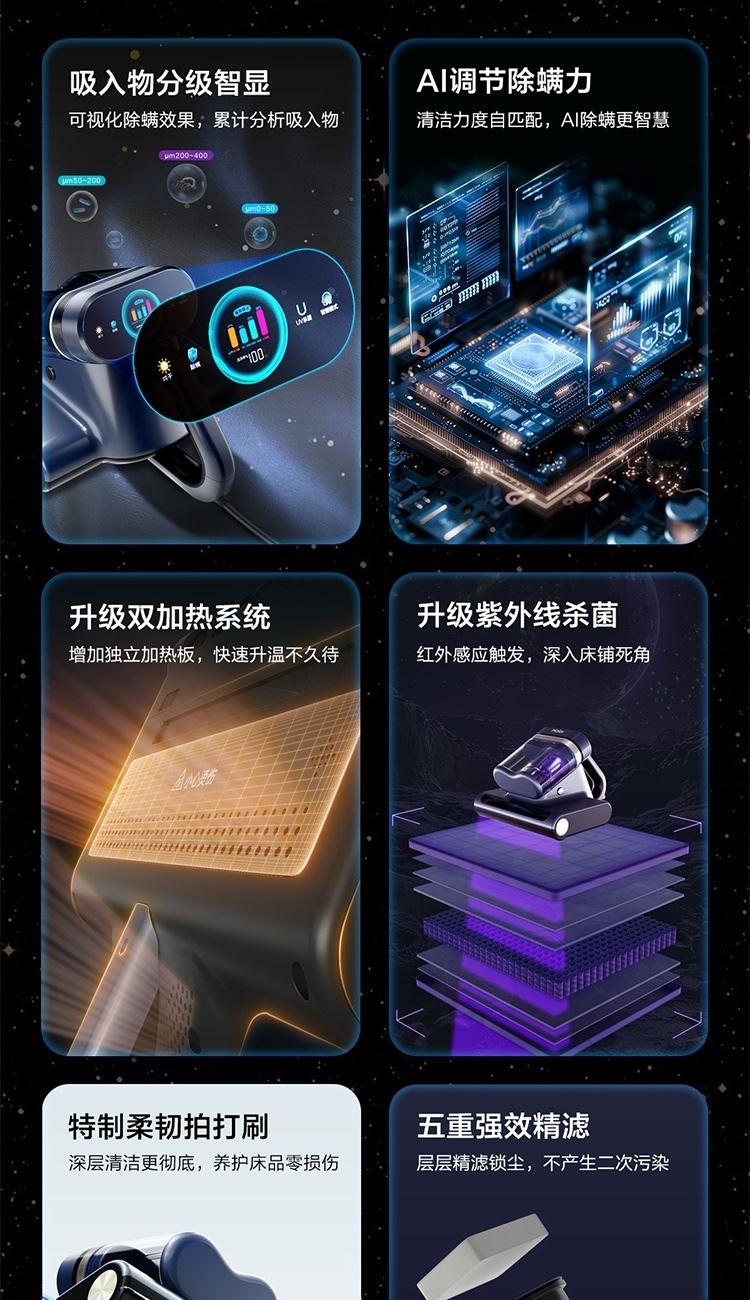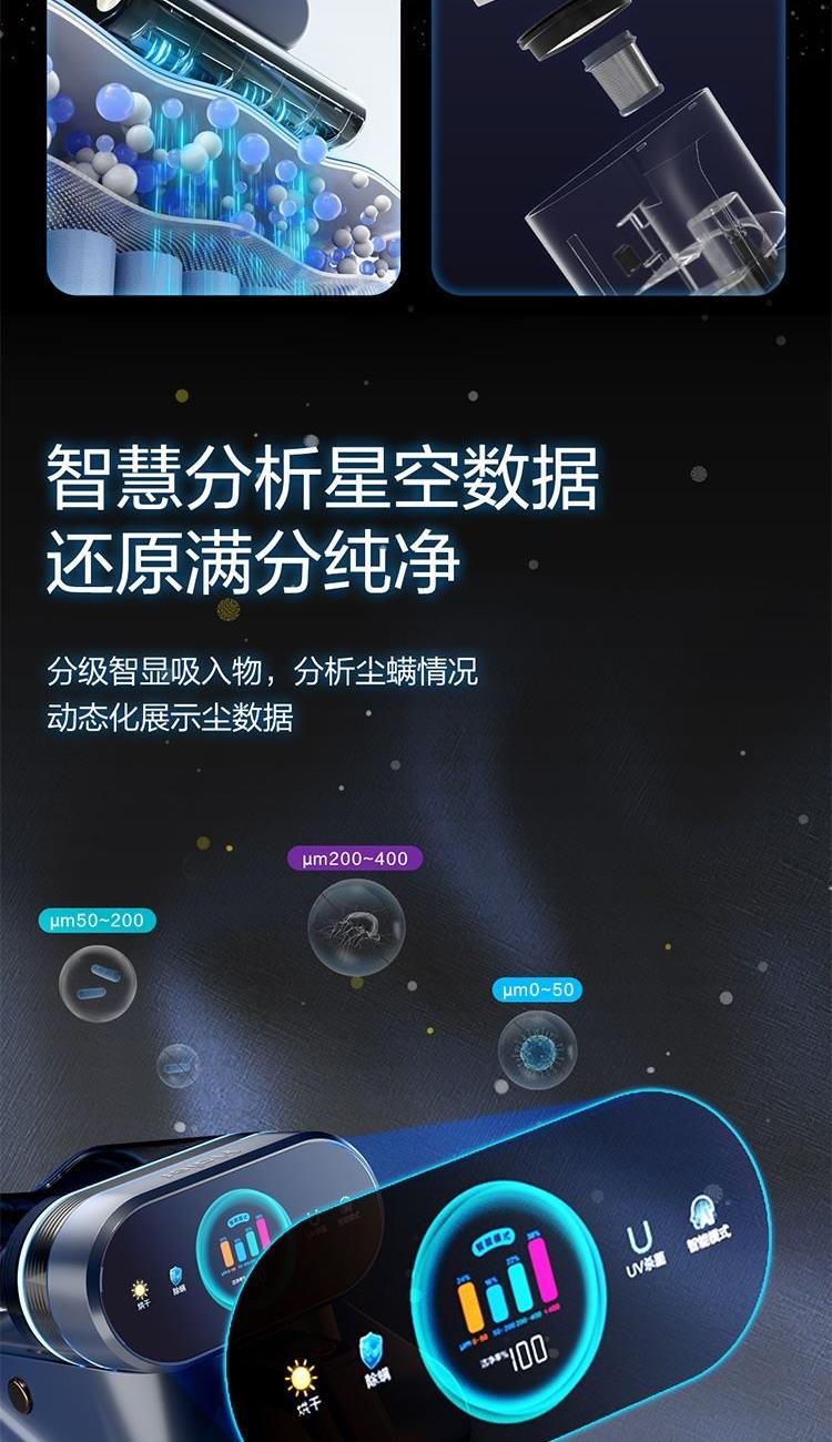 集塵容量: 0.5L 拍打頻次 :70000次/min 額定功率: 650 w 真空度 :16KPA 加熱方式 :熱風(fēng)+金屬面板 電源線 :5m 過濾方式: 海帕+不銹鋼網(wǎng)罩 海綿 1.除螨效果清晰可見:屏幕吸入物分級(jí)顯示+整體潔凈度顯示+環(huán)形指示燈顯示 2.烘干快捷舒適:60℃恒溫控制,獨(dú)立加熱板+熱風(fēng)雙加熱系統(tǒng),加熱板觸摸把手自動(dòng)開啟
